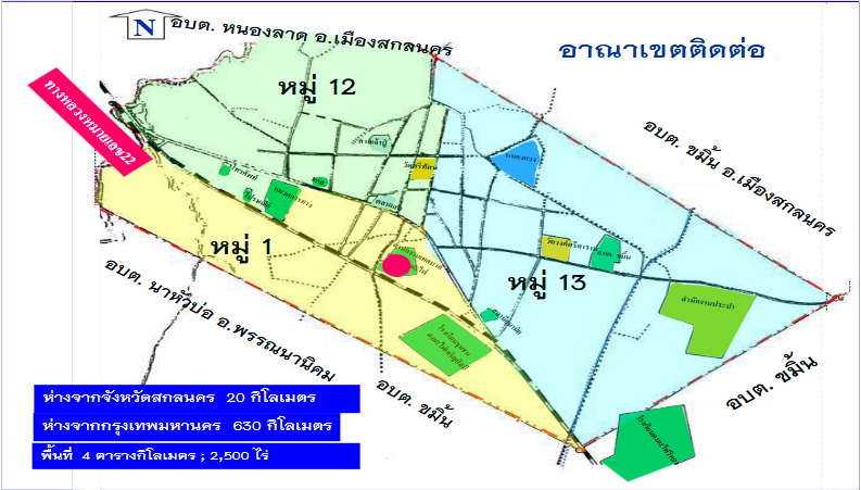 อาณาเขตทางทิศเหนือ ติดต่อกับ ตำบลขมิ้นและตาบลหนองลาด อำเภอเมืองสกลนคร